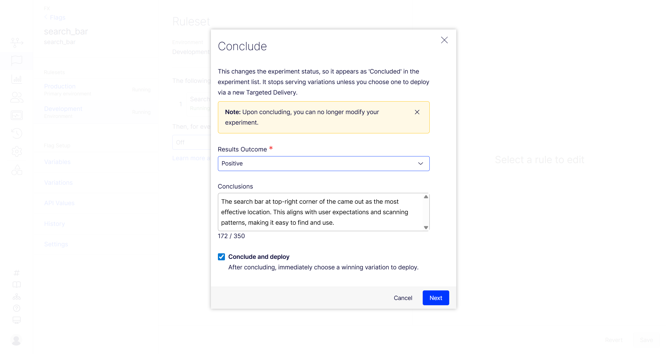 When you conclude a rule, you can select the outcome of your rule and add a summary of what you learned from your hypothesis. This helps track whether the experiment had a positive, negative, or inconclusive result.