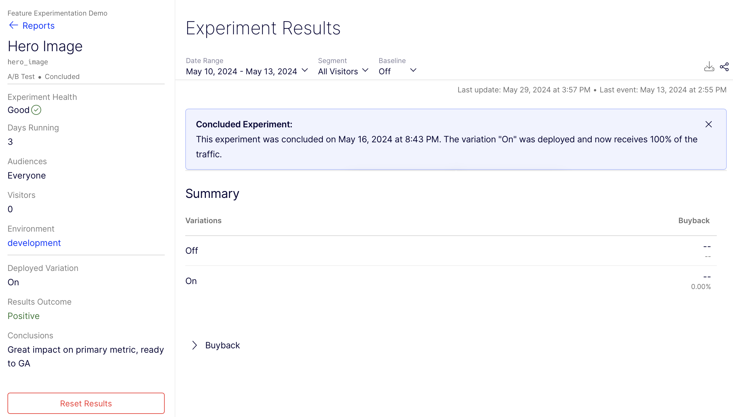 If you see a winning variation on your Experiment Results page, you may decide to deploy that variation to route incoming traffic to the winner to increase conversions. Instead of relying on developer resources to implement the winner in your source code, you can use Optimizely Feature Experimentation to deploy the winning variation instantly. See the walkthrough to see how to conclude an experiment in action.