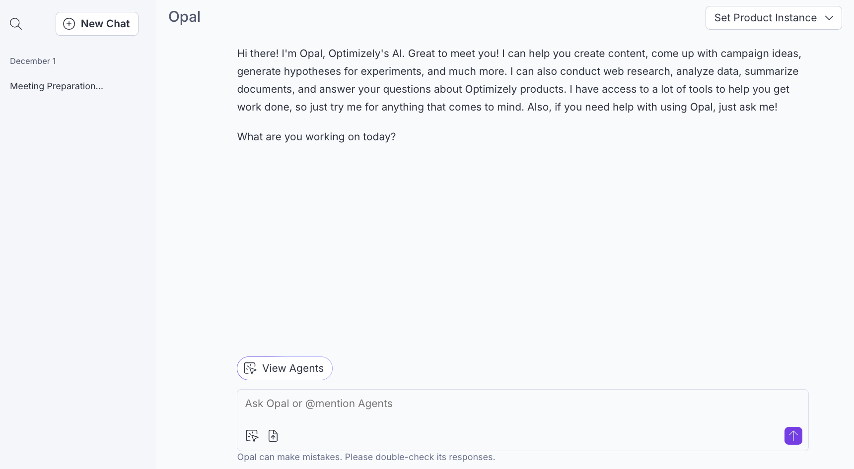 You can ask Opal questions, make requests, or give instructions, and Opal determines the right tools and agents to use to deliver accurate, actionable results. Whether you need to generate content, analyze data, or manage experiments, Opal Chat provides a simple, intuitive way to work directly within the Opal platform.