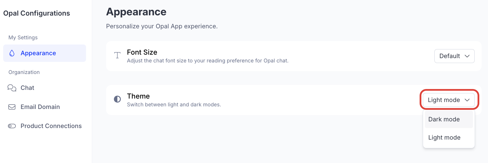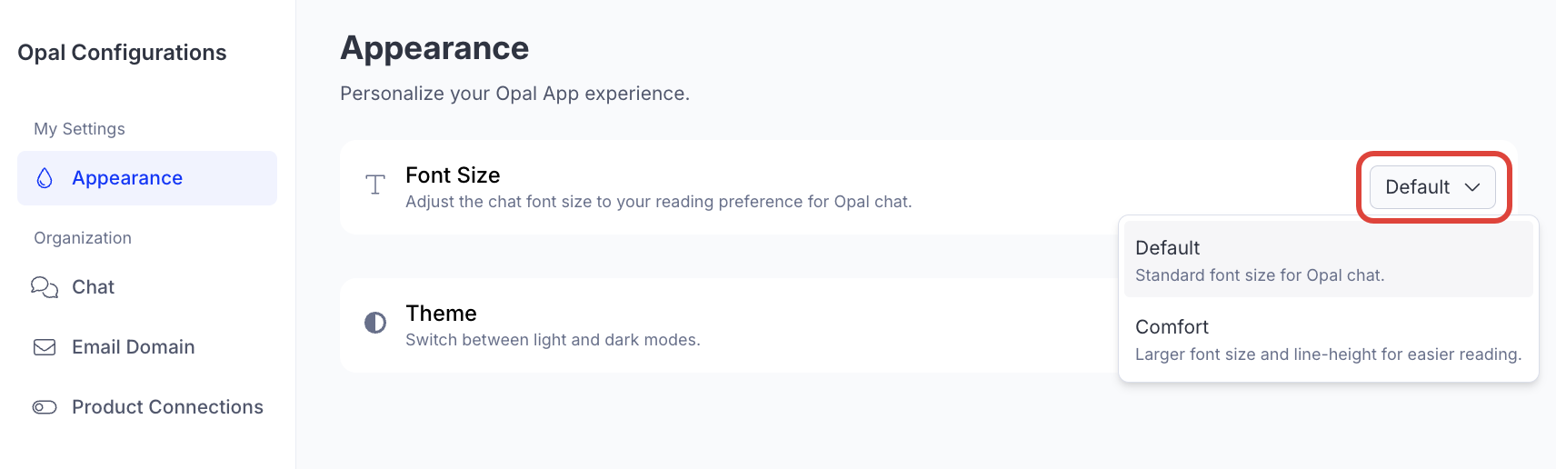 Go to Settings > Appearance to configure the Font Size and Theme for your Opal app experience. These settings are for your individual Opal instance only and do not affect other users in your organization.