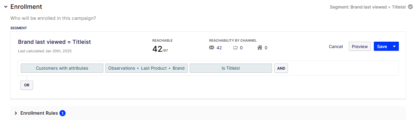 Target the right audience – As a specialty shop that prides itself on knowing what your customers are looking for, you want to avoid emailing everyone and instead create a customer audience in your one-time campaign that only consists of individuals whose last viewed product brand is Titleist.