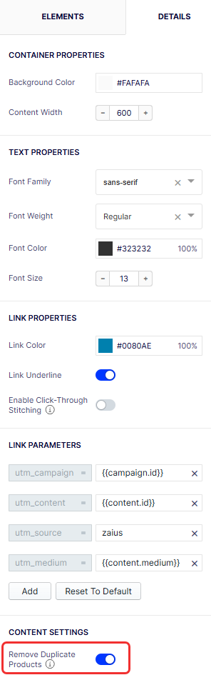 - Enable Remove Duplicate Products in the Content Settings section of the Details tab.