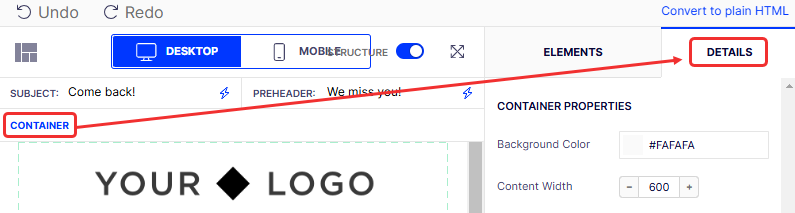 - Go to the Details tab for the email Container, which displays when you do not have any elements selected in the email editor.