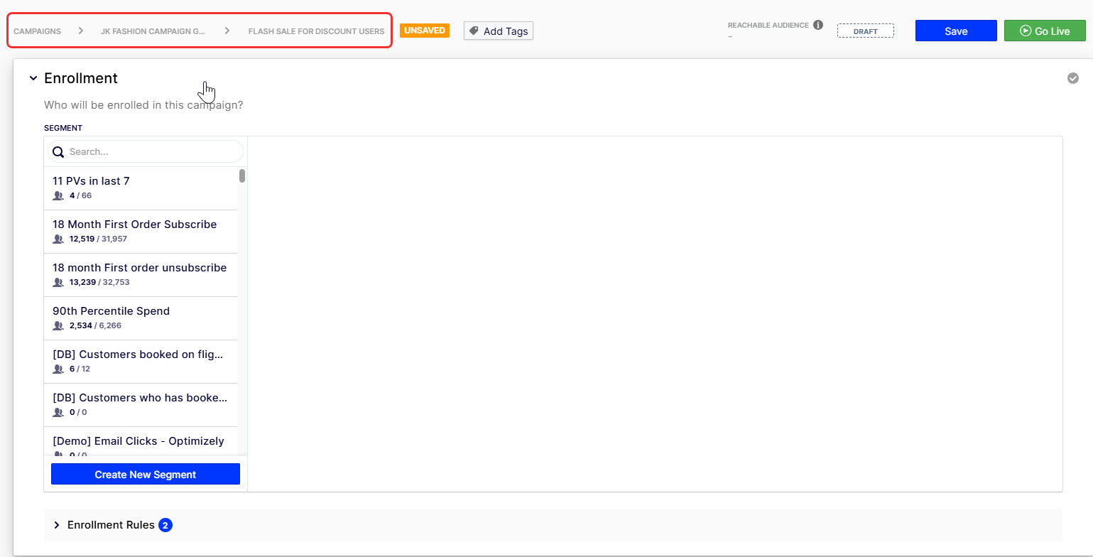 - Continuous – A campaign is sent every time customers meet the campaign's enrollment segment and rules.