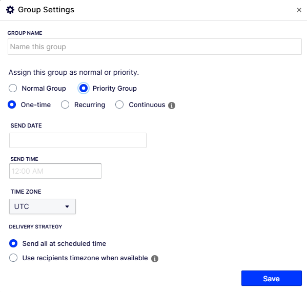 To enable prioritization, select Priority Group when creating a campaign group. You must choose which campaign type to apply to the campaigns in the group.