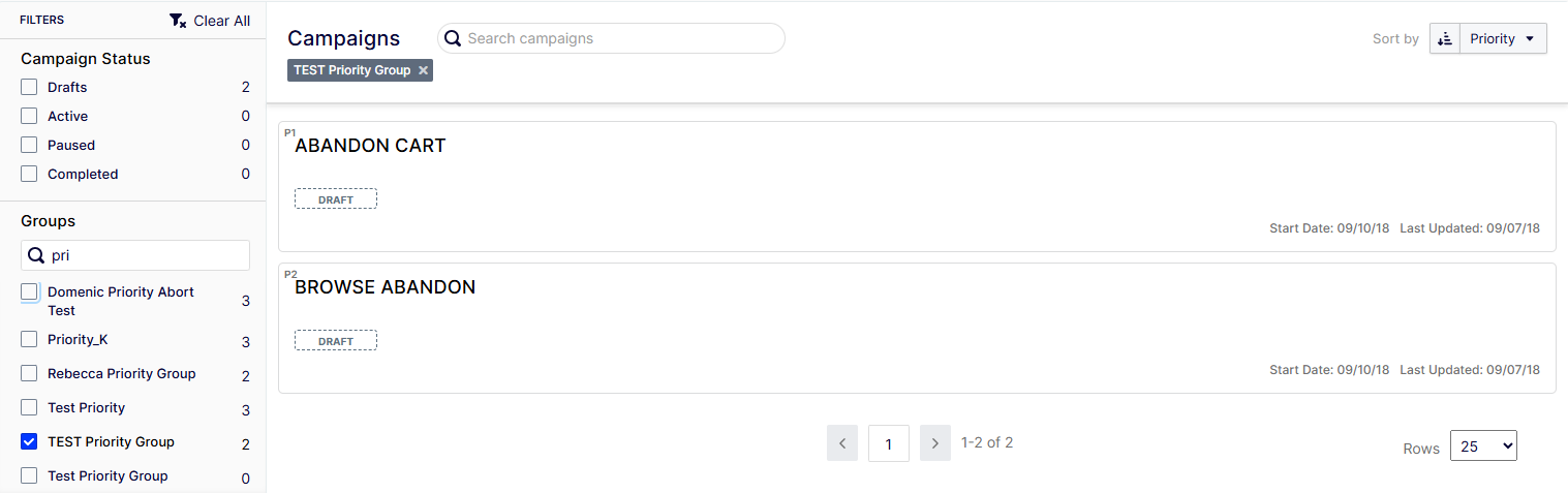 You can change the priority order by hovering over the campaign you want to move and moving the campaign using the drag icon.
