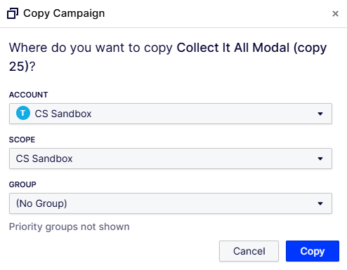 - Click Copy and select the Account, Scope, and Group you want to move the campaign.