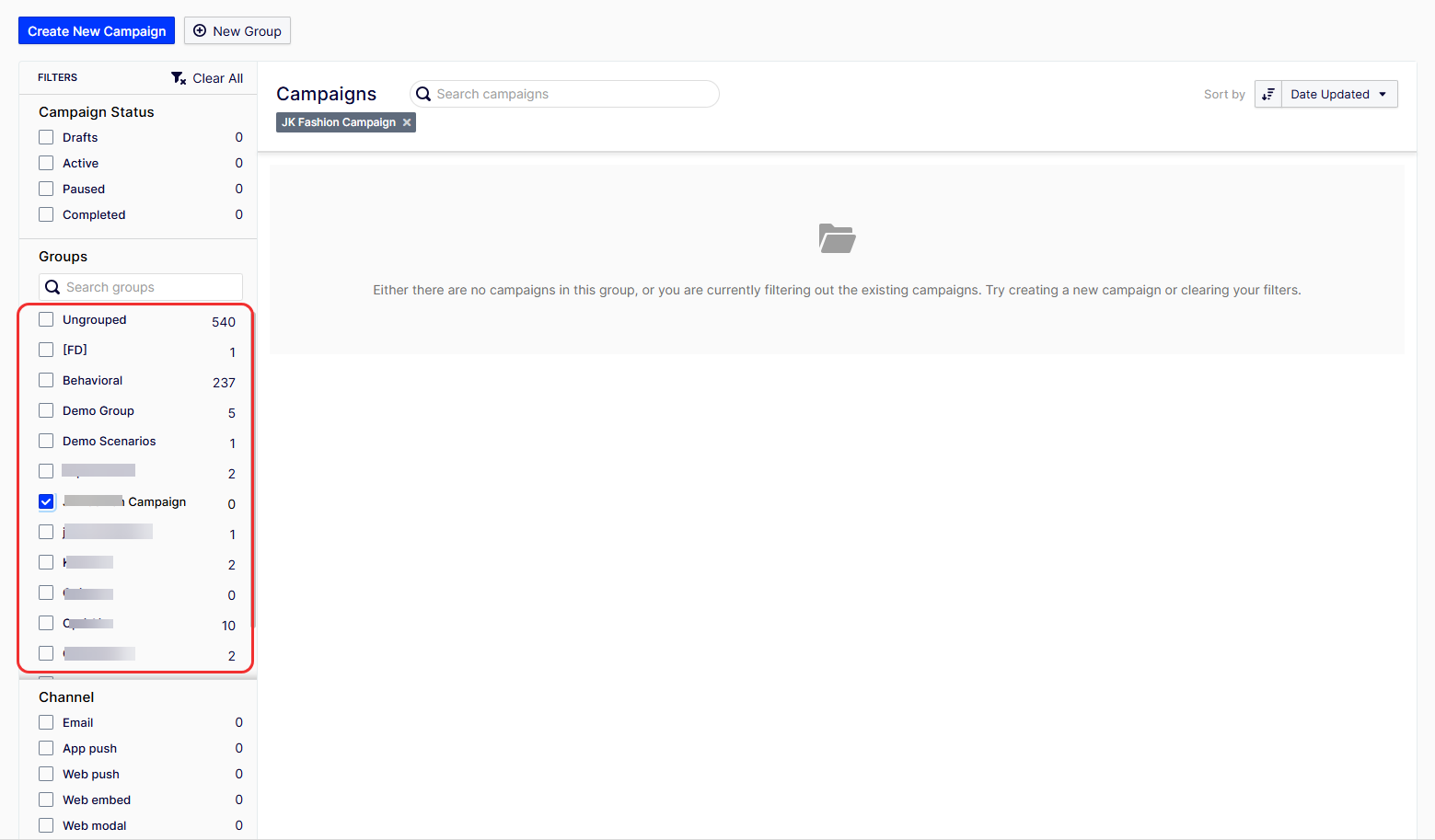 When you create a group, ODP adds it to Activations > Groups. To add a campaign to your group, complete the following: