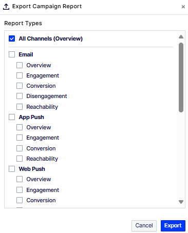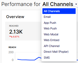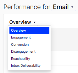 Select a channel to see the Overview report. You can expand Overview and choose other types of reports (Engagement, Conversion, Disengagement, Reachability, and Inbox Deliverability) from the drop-down list. The availability of the reports in the drop-down list depends on the selected channel. For example, the Inbox Deliverability report is only available for Email.