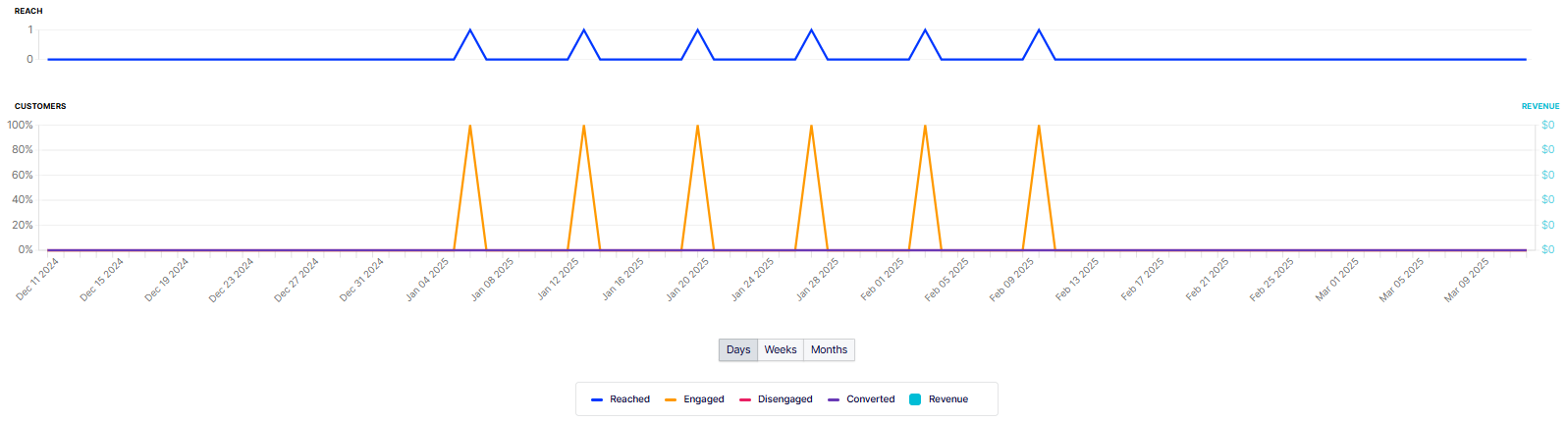 You can also switch between Days, Weeks, and Months to view the campaign performance for specific days, weeks, and months.