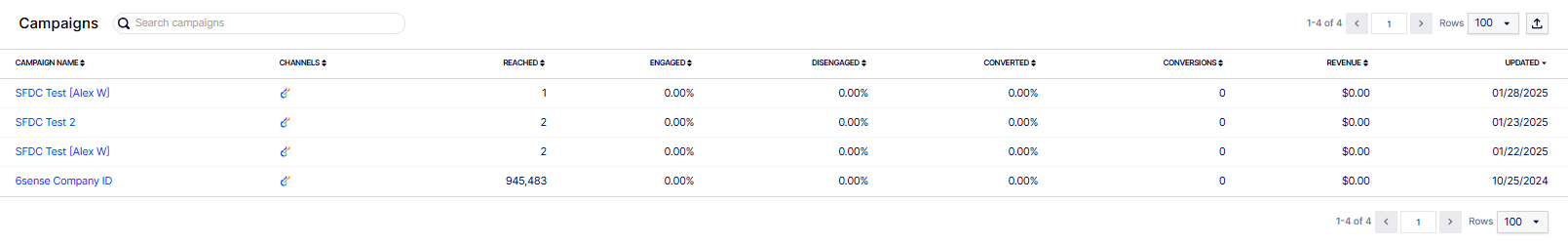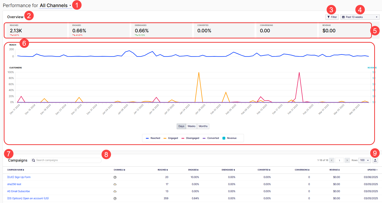 You can see each campaign's corresponding performance metrics. The default All Channels overview report displays metrics for Reached, Engaged, Disengaged, Converted, Conversions, and Revenue. The Channels column displays the channels through which the campaigns were sent.