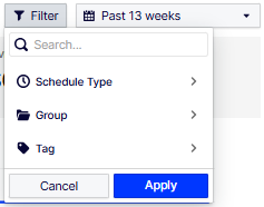 Apply filters to refine the campaign types you want to analyze. You can filter by Schedule Type, Group, and Tag. Changing the filters affects the aggregate metrics, charts, and campaigns in the campaign performance table.