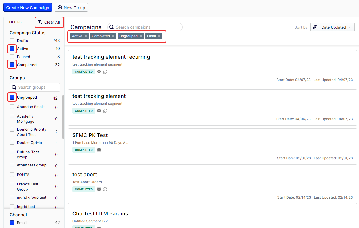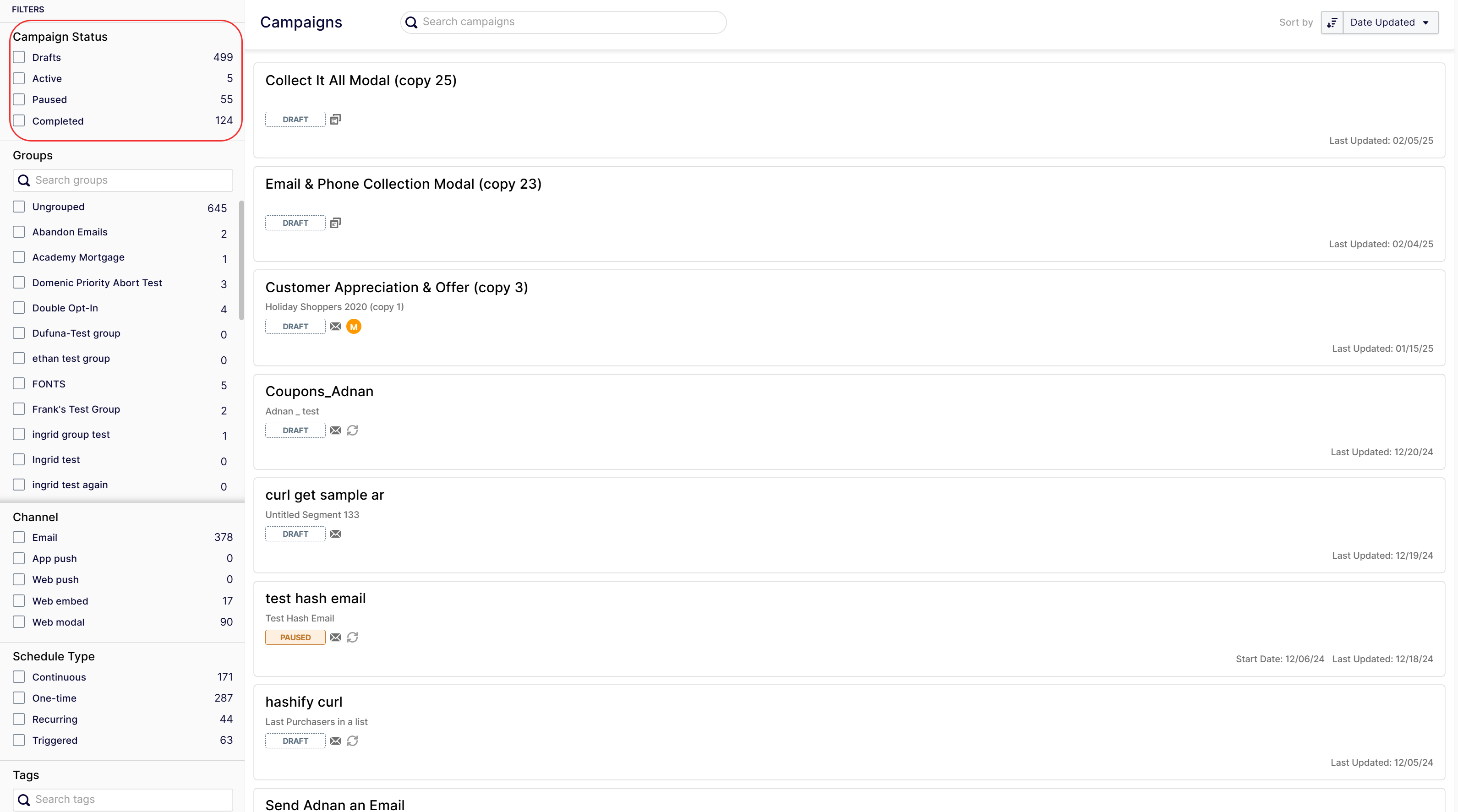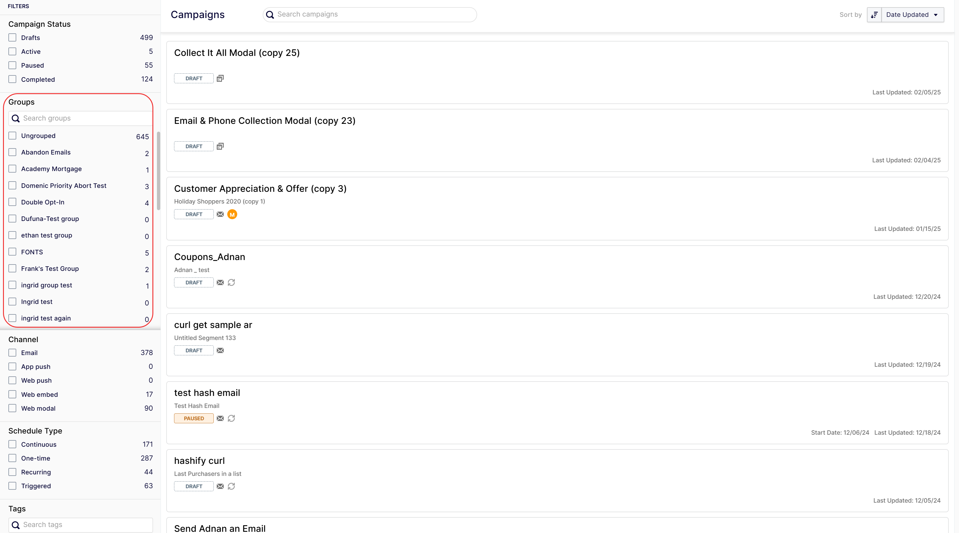 Use Groups to review the metrics for campaigns organized into specific groups. You can also use groups to prioritize campaigns when running multiple campaigns simultaneously. See Create and manage campaign groups.