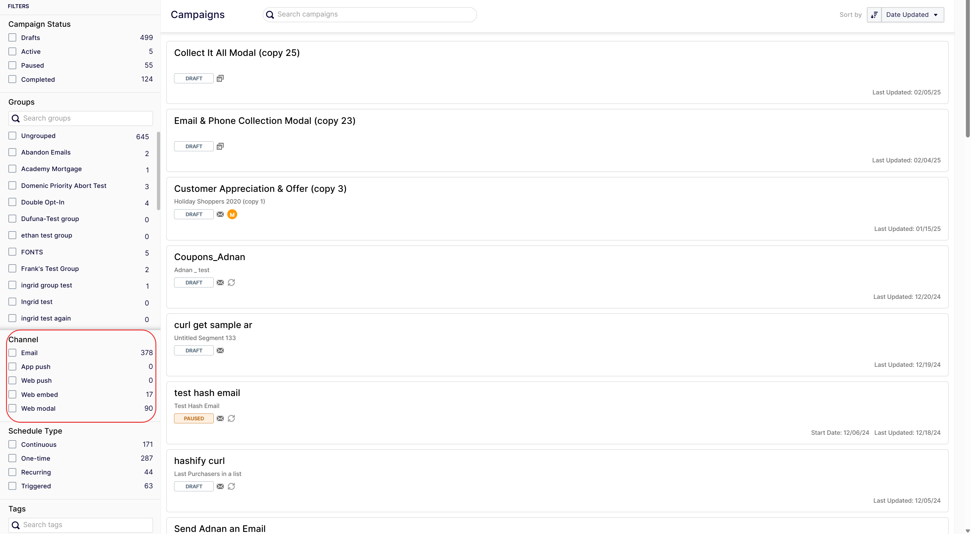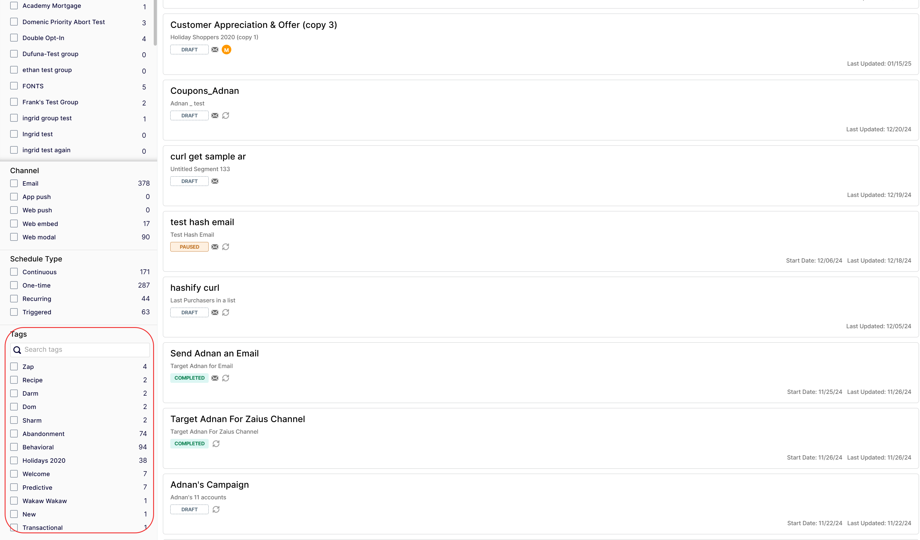 You can apply Campaign Status, Groups, Channel, Schedule Type, and Tags filters for the campaigns in Activations > Overview.