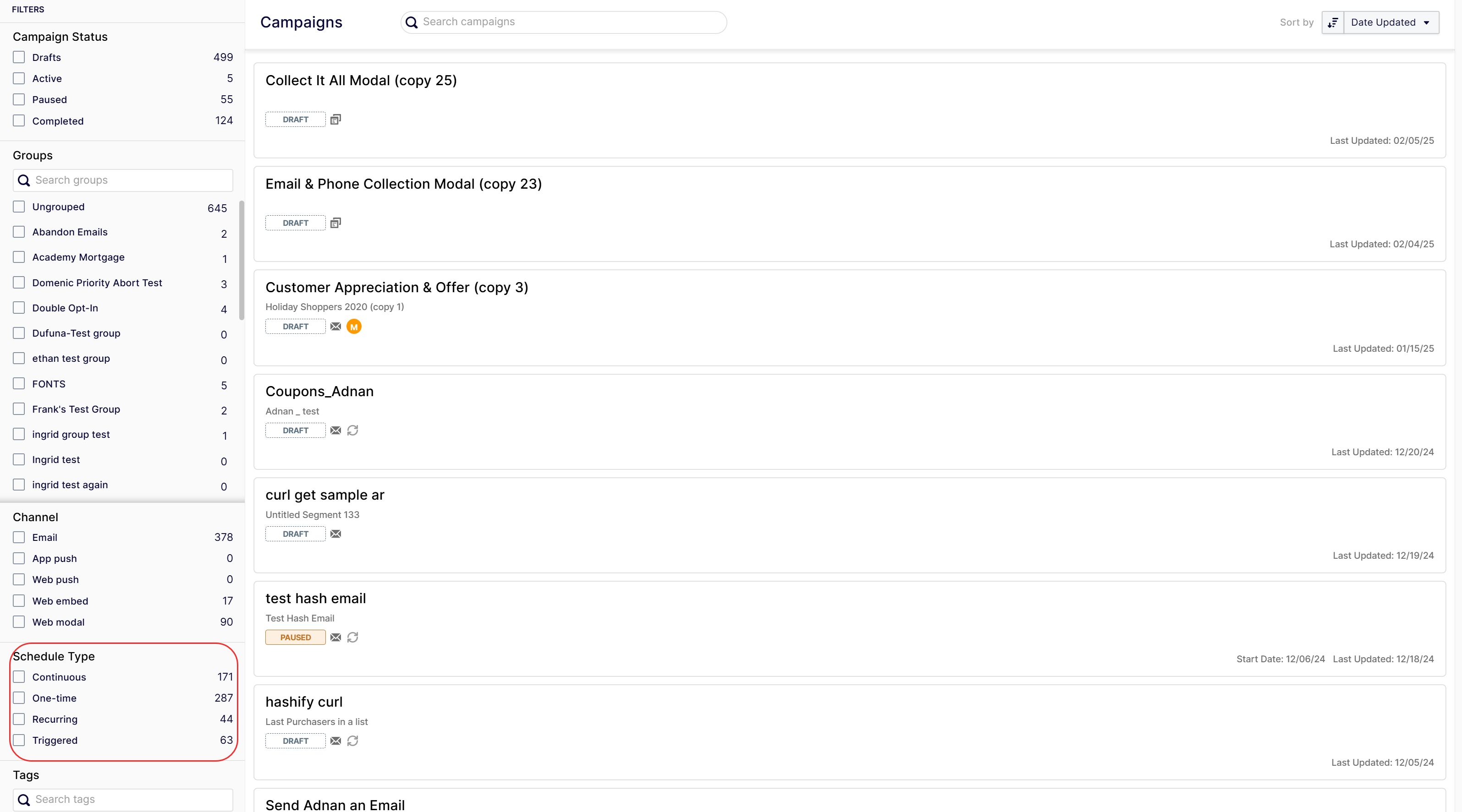 Use Schedule Type to compare and contrast the performance of your one-time campaigns to that of your autonomous campaigns. For one-time campaigns, select One-time. For autonomous campaigns, select Continuous, Recurring, and Triggered.