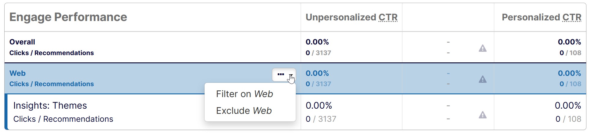 - All Recommendations – Filter the entire engage dashboard by selecting a filter from the drop-down list. The data inside the performance tables also changes when you set a filter to reflect the filter's values.