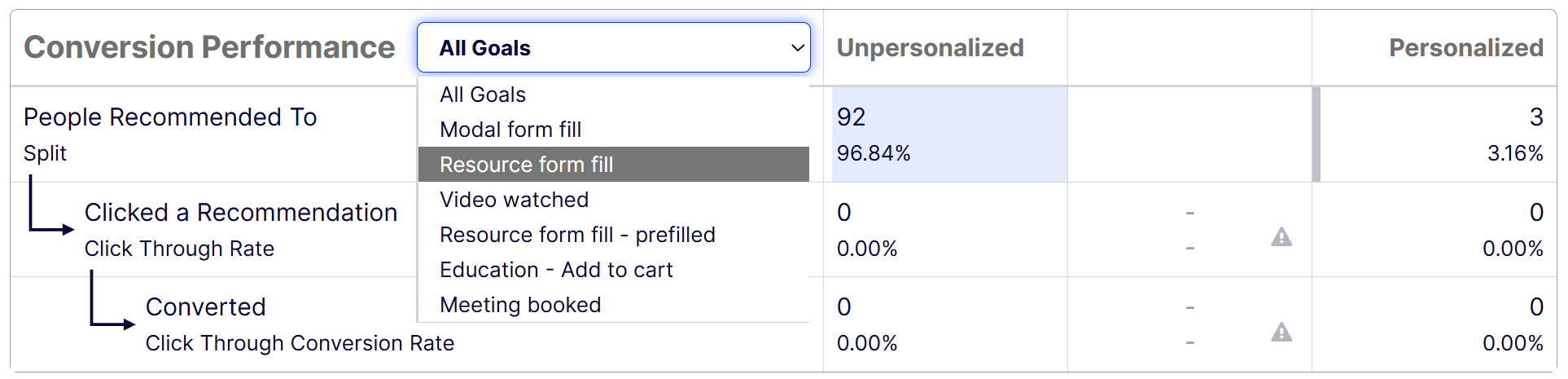 The Conversion Performance table displays the conversion rate for each goal. You can select the goal from the All Goals drop-down list, which compares unpersonalized conversions to personalized ones.