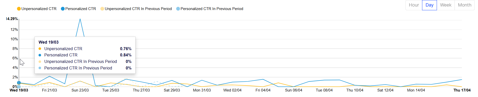 - The dotted line in the graph displays Unpersonalized CTR in Previous Period and Personalized CTR in Previous Period . You can follow it to see the difference between personalized and unpersonalized recommendations made over your chosen period. Hover your cursor over a specific date to see comparison details.