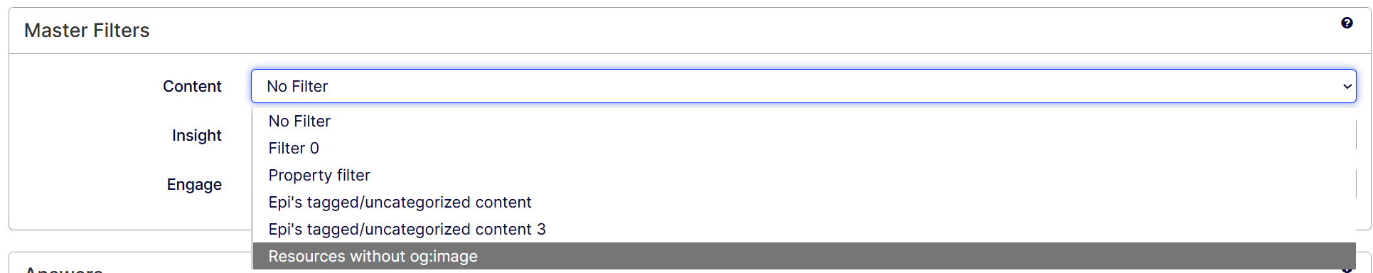 Master Filters – Choose your Content, Insight, or Engage filters from the drop-down lists. If you select a filter as your master filter, your dashboard always displays the data for your selected filter. For example, if you previously created a filter in the Content Dashboard to display properties and you select that filter from the Content drop-down list, your dashboard only displays the data for properties every time you log in.