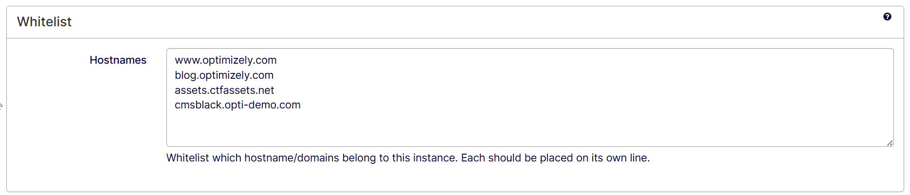 Whitelist – Enter the hostnames and domains associated with the Content Recommendations instance to permit interactions and content from these sources. Provide each entry on a separate line.