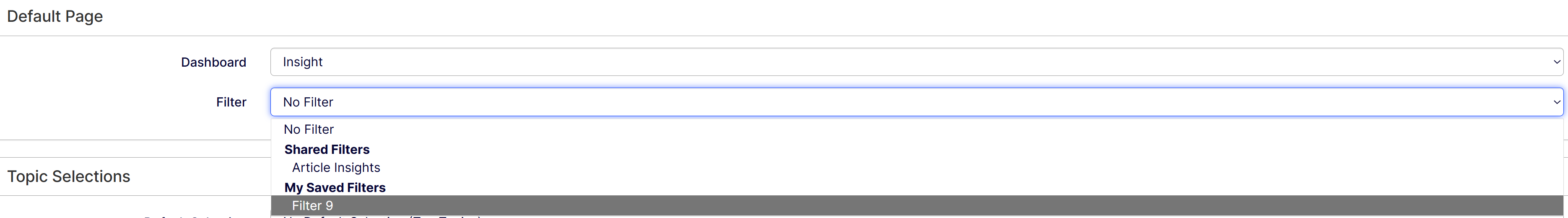 Select your top topics from the Topic Selections > Default Selection list. The list displays the saved selections from your dashboard. If you choose a selection, your default dashboard always displays this selection as the Top Topics.