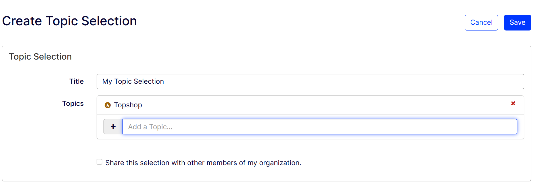 Click +Create Topic Selection. You are redirected to the Create Topic Selection page.