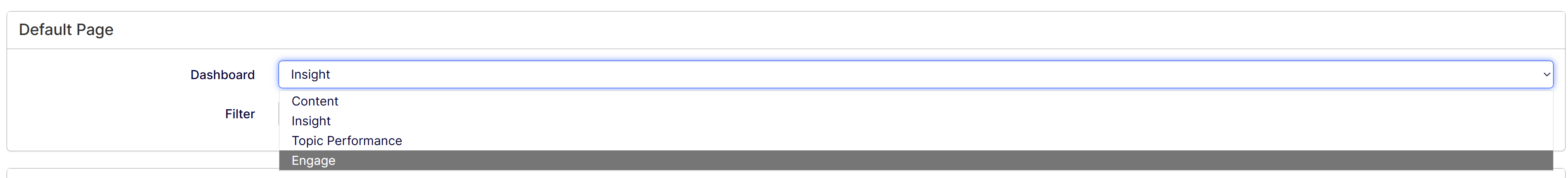 Select a dashboard from Default Page > Dashboard drop-down list. This displays as your default main page each time you log in to Content Recommendations.