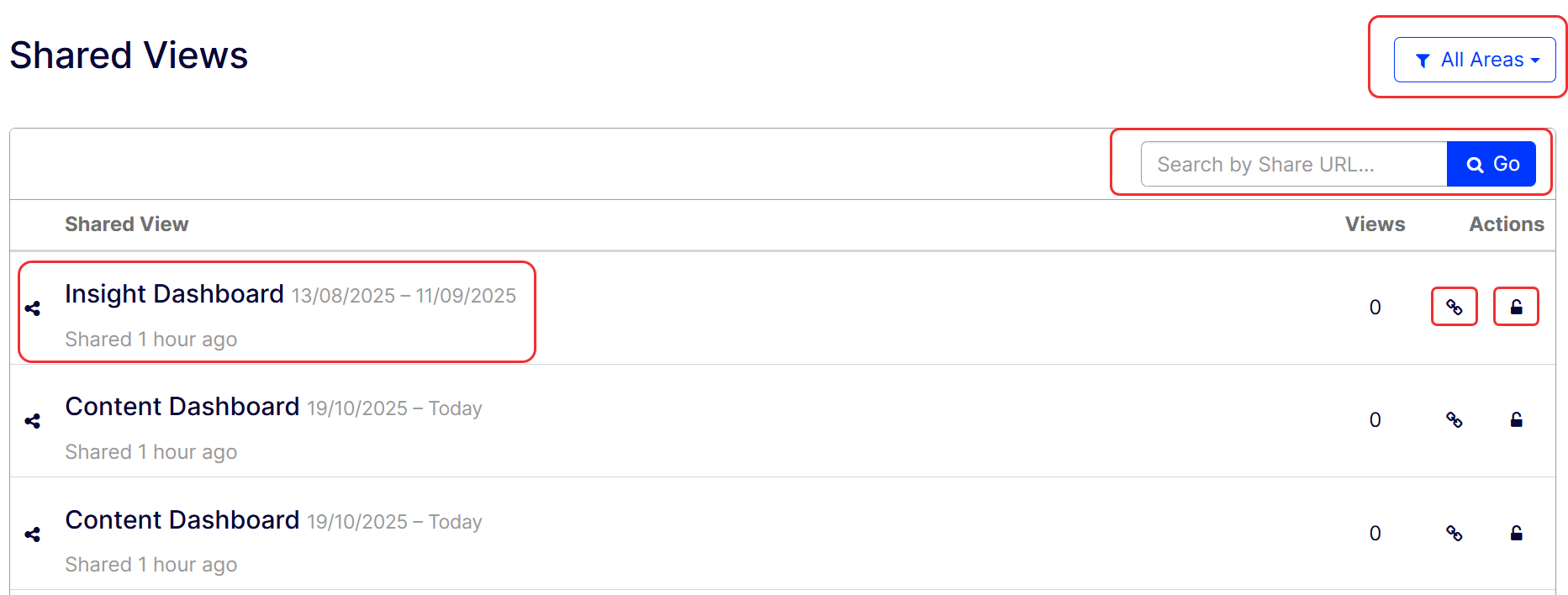 Choose a dashboard from the All Areas drop-down list to view the shared views of that dashboard only.