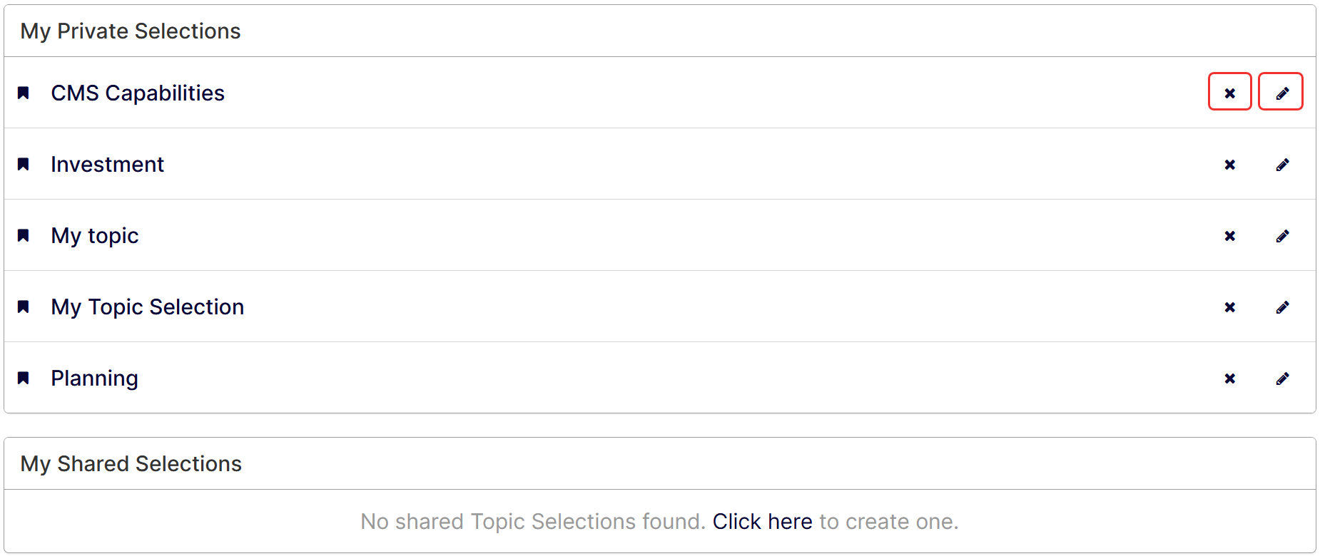 Click Edit or Delete if you want to edit or delete a selection from the My Private Selections or My Shared Selections list. Alternately, visit the Edit Topic Selection to delete the selection.