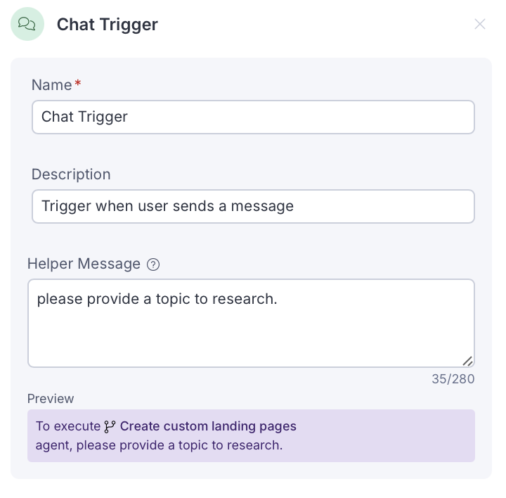 - (Optional) Enter a Trigger Message. The trigger message is standard plain text written in natural language that the workflow sends to the next agents when the trigger occurs. No special syntax or templating language is required. Write your request exactly as you would type a chat message to an AI agent.