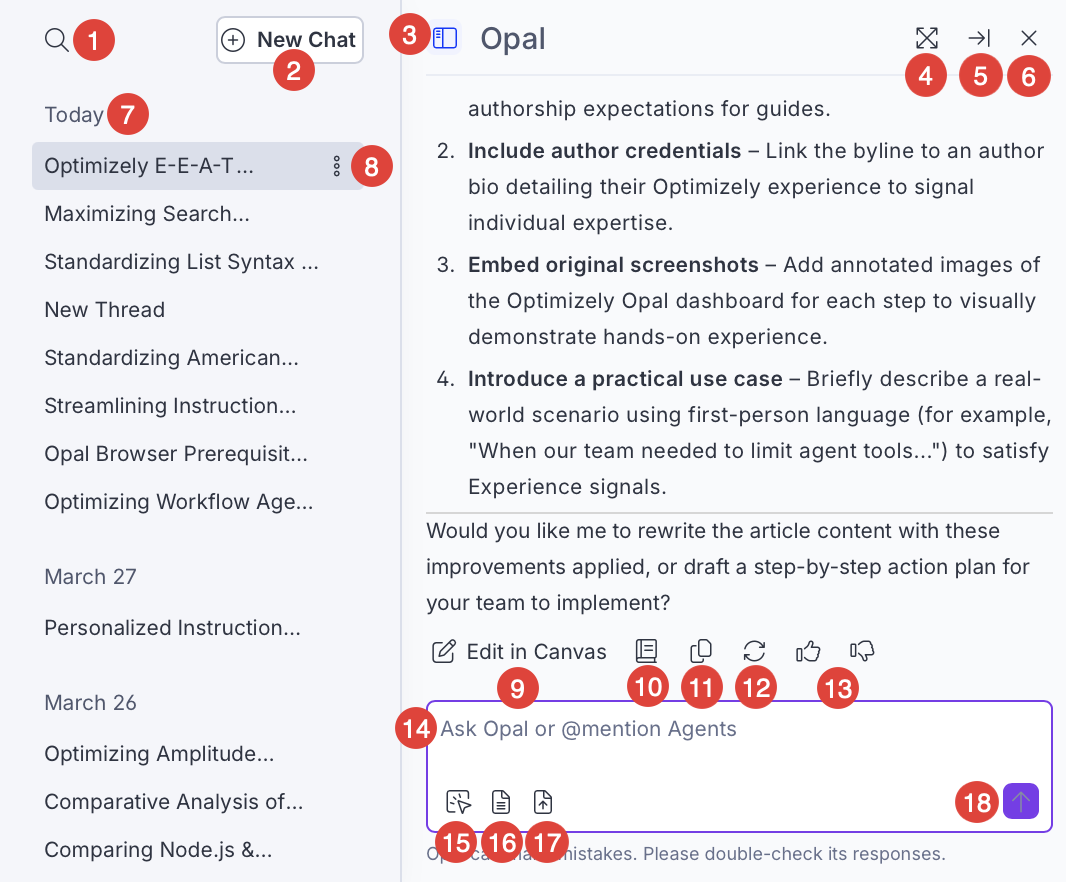 - Chat history – Go to previous chat threads with Optimizely Opal.