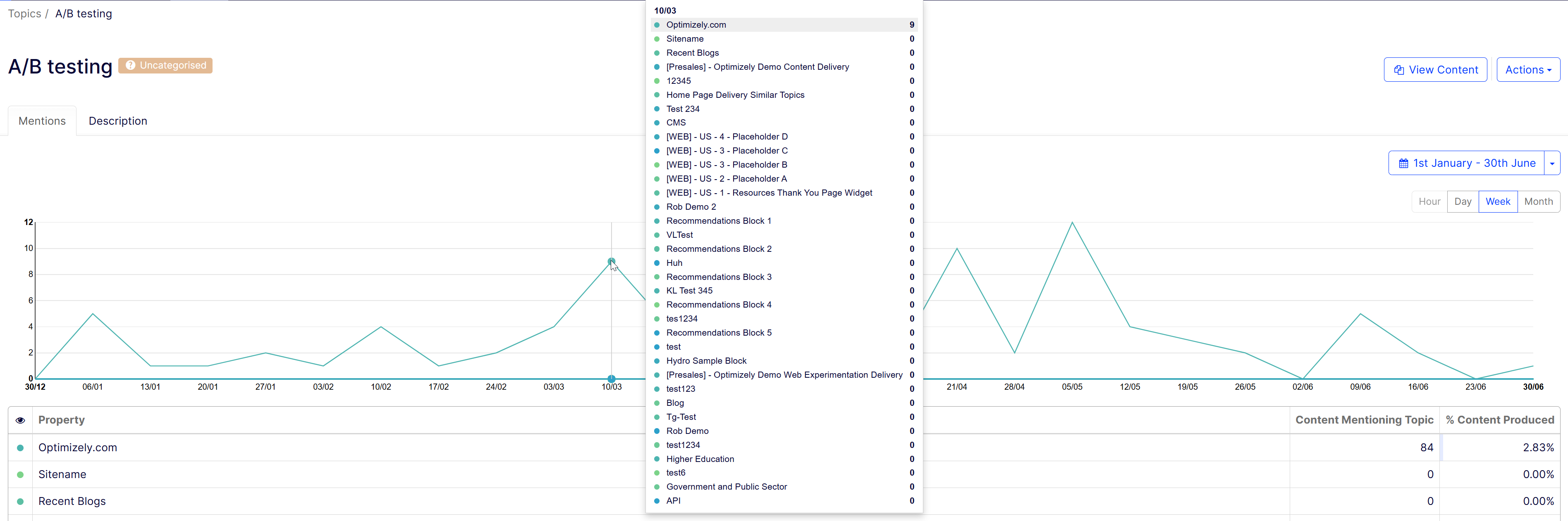 Mentions line chart – A line chart displaying the number of times your topic was used in properties. You can view data for hourly, daily, weekly, or monthly periods, depending on your selected time frame. Hover over the line to view details.