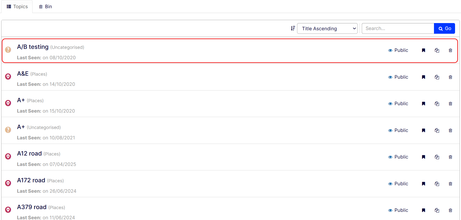 Add to topic selection, make public, or bin a topic