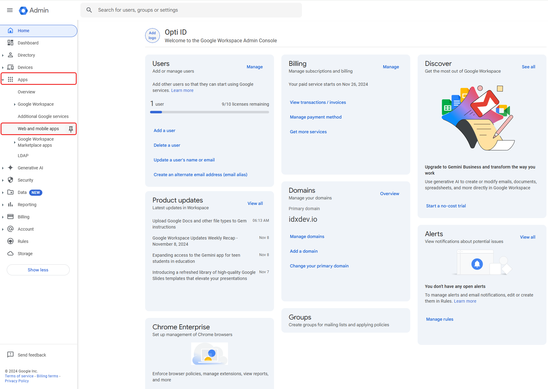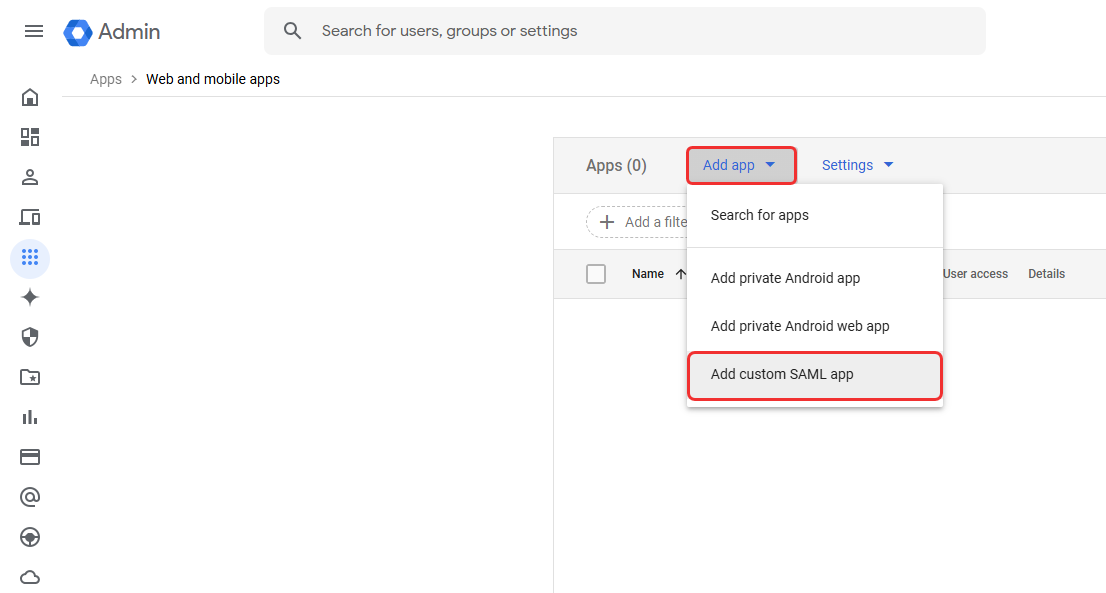 1. Log in to the Google Workspace Admin Console and select Apps > Web and mobile apps.