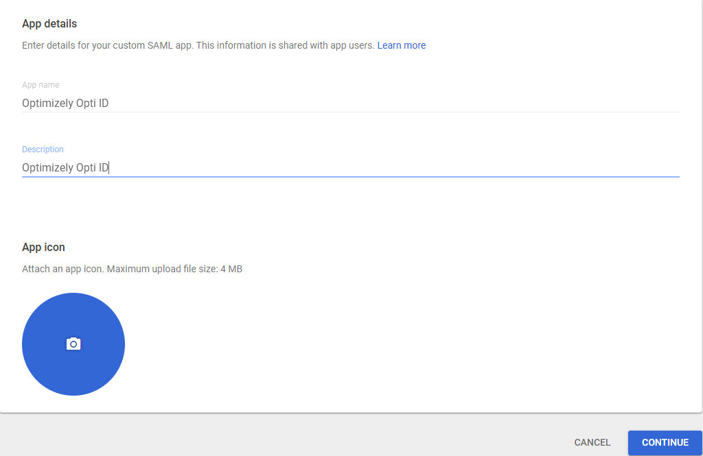 3. Enter the App name (for example, Optimizely Opti ID) and an optional description. Click Continue to display further configurations.
