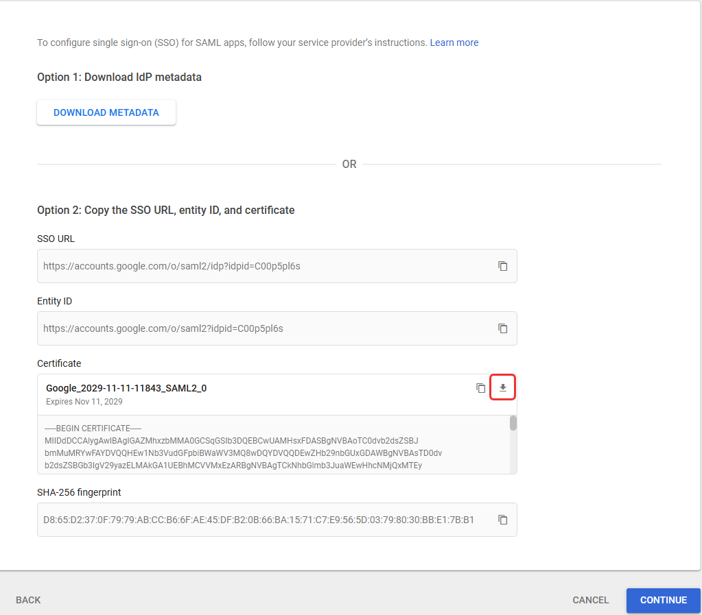 • Certificate – The security certificate used to establish trust between the Identity Provider and the service provider. It includes the certificate name and its expiration date. You can click the download button to download the certificate.