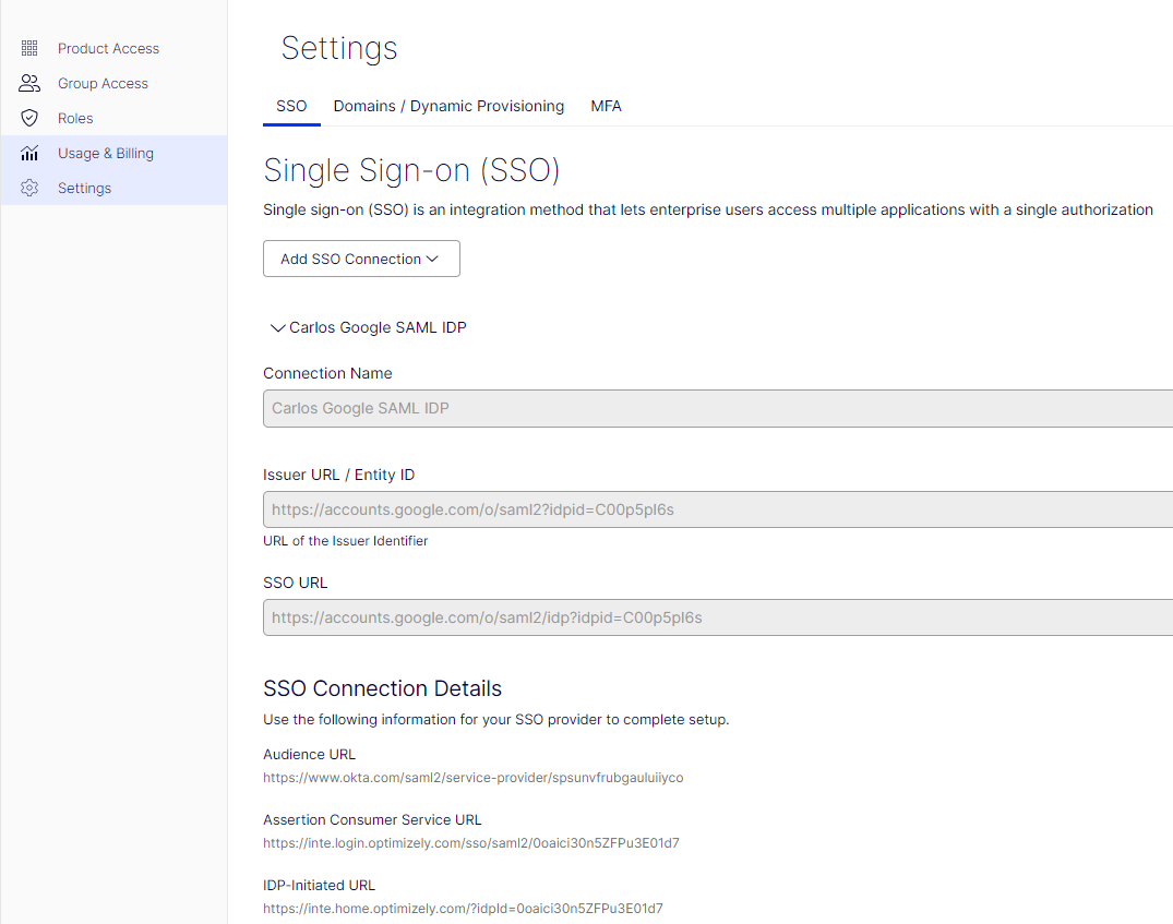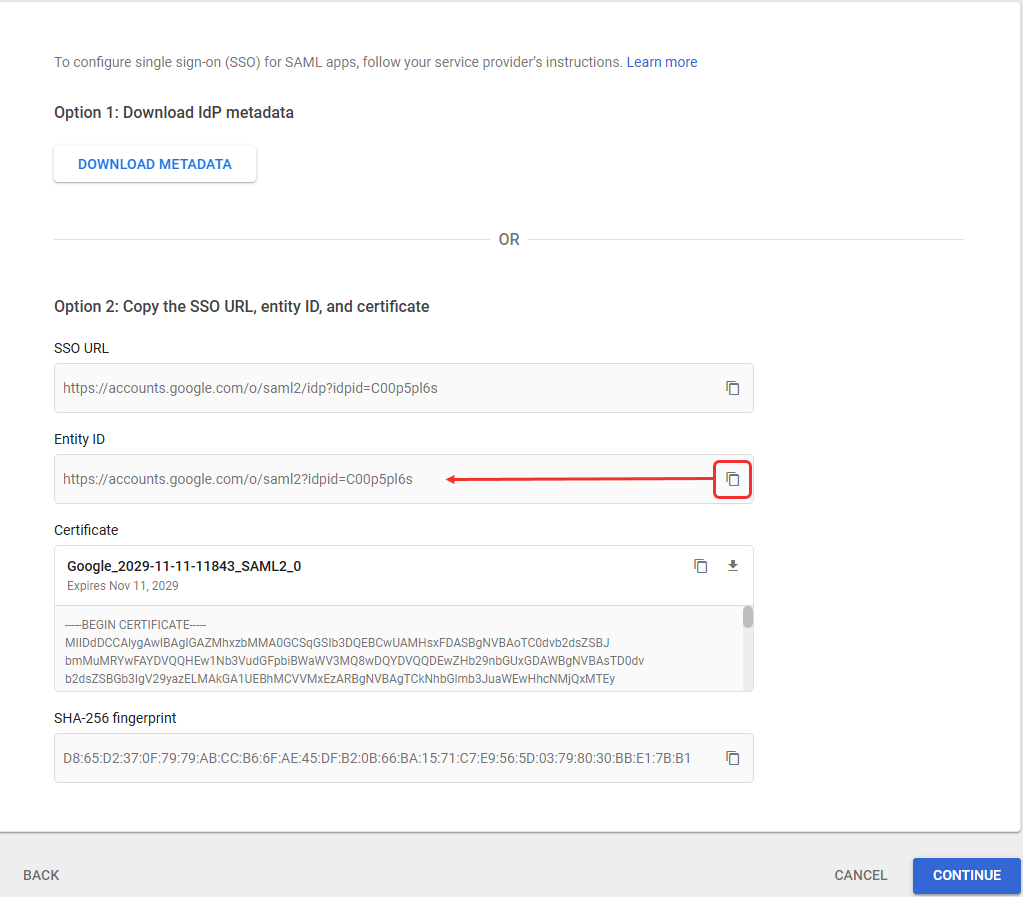 • Option 2: Copy the SSO URL, entity ID, and certificate – Configure SSO manually.