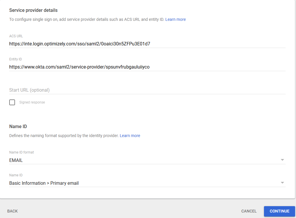 9. Return to the Add Custom SAML app window in the other browser tab and click Continue. The Service provider details window displays more fields.
