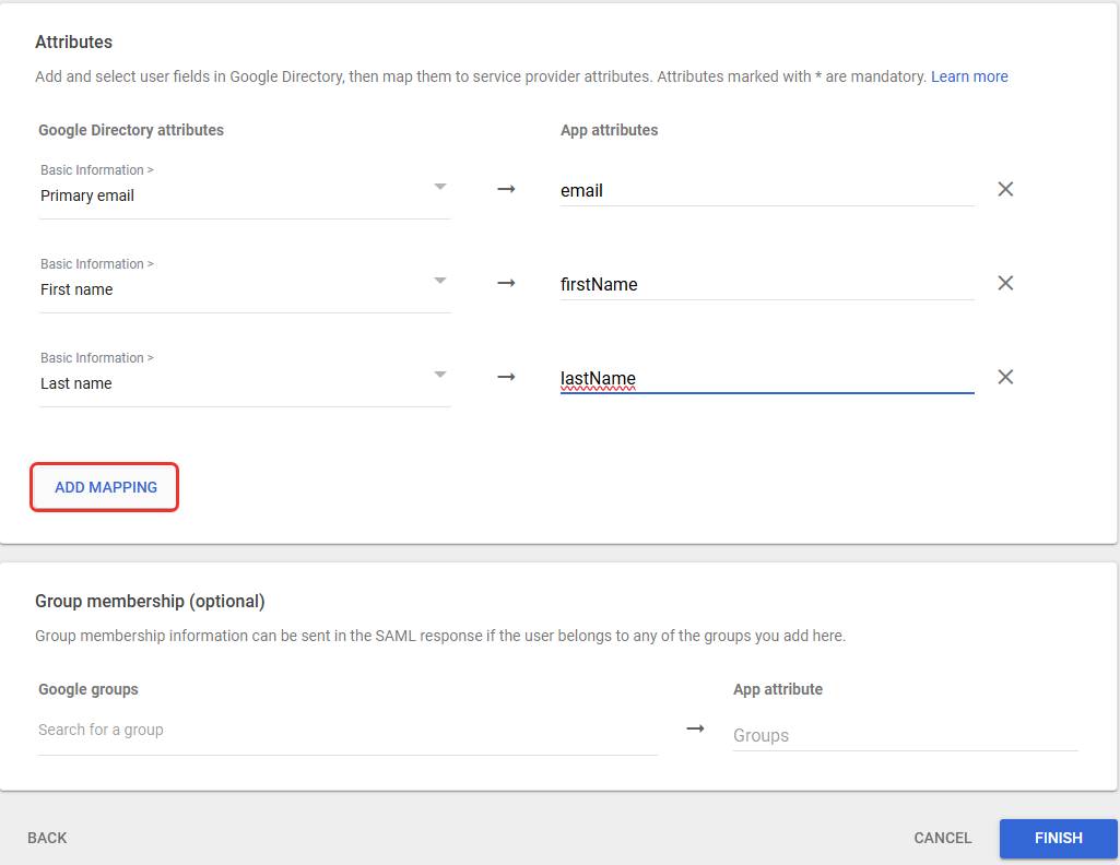 12. Click Add mapping to add a row at a time to map the following fields between Google Directory and the App attributes. App attributes are case-sensitive.