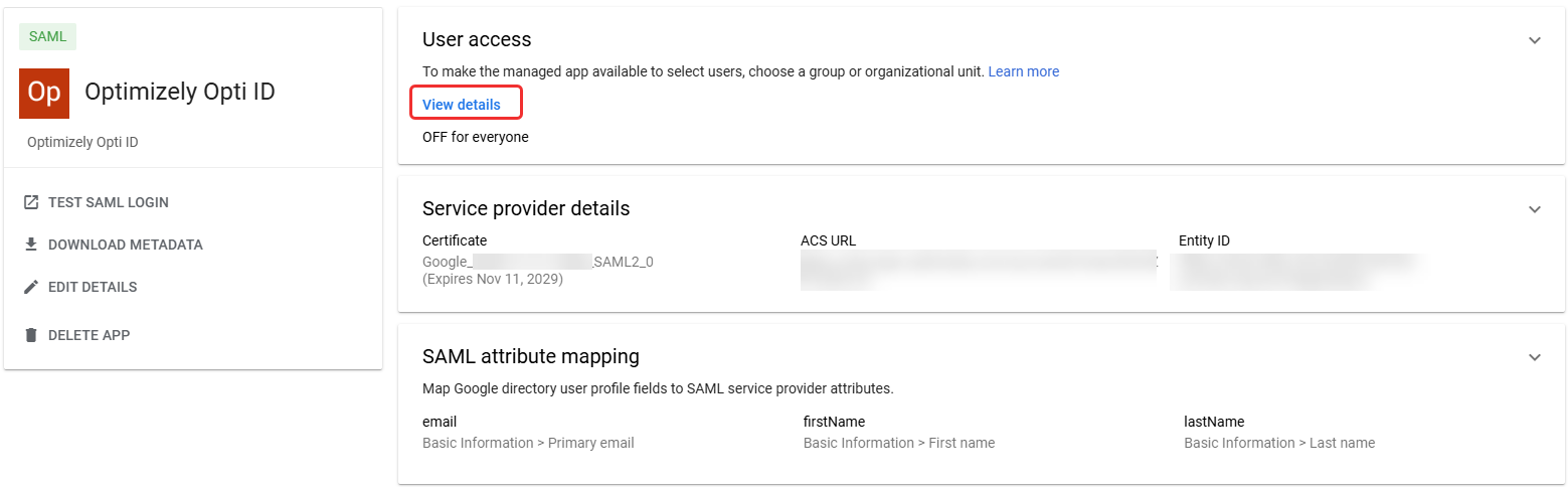 14. Click View Details in the User Access section to assign the SAML application (created in the previous section) to the user (or a user group in your IdP to which the user belongs). To configure roles, see Roles. To configure groups, see Groups.