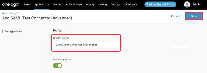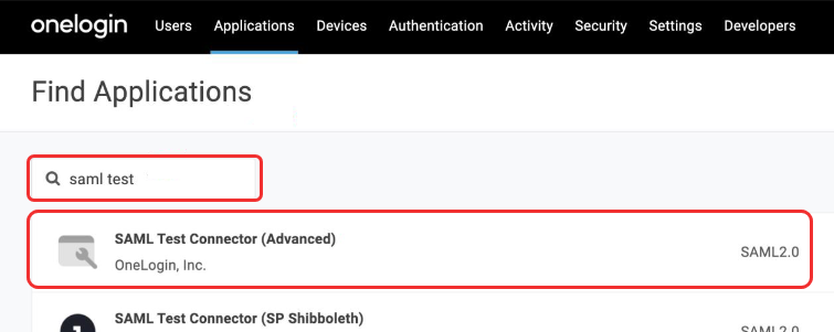 In the Search field, enter saml test and select SAML Test Connector (Advanced) from the results list.