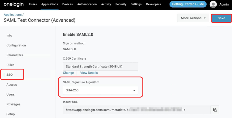 - Go to the SSO tab, change the SAML Signature Algorithm dropdown to SHA-256 and click Save.