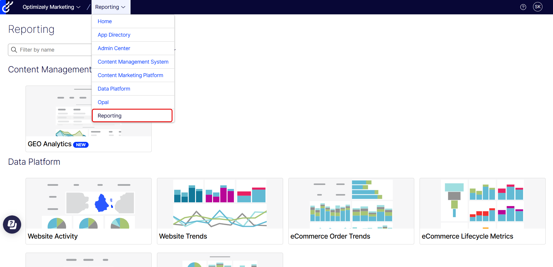 Select Optimizely Reporting or use the product switcher in the global navigation bar.