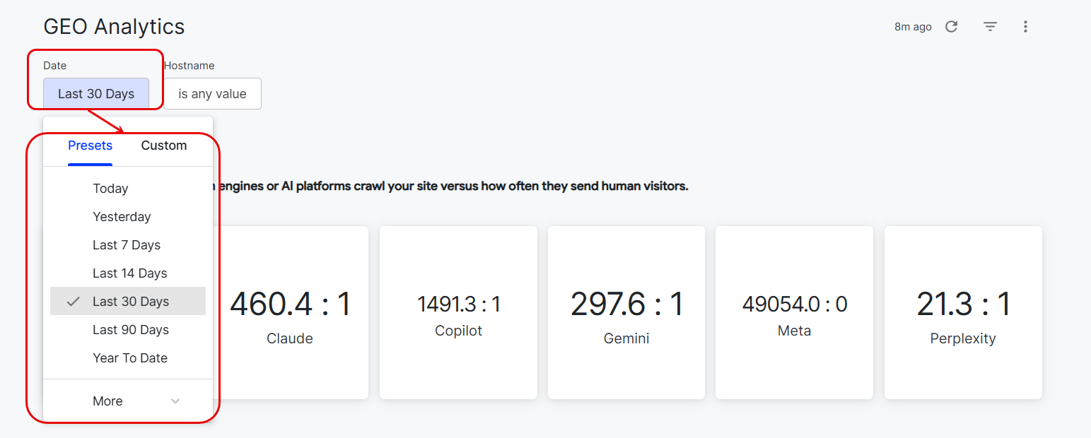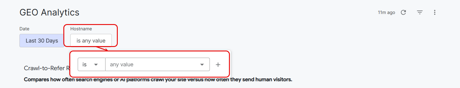 You can also compare the crawl-to-refer ratio with the previous period for the selected timeframe. For example, if you select Date > Last 30 Days to filter the data, you can view the ratio for the preceding 30 days. This comparison helps you understand how the ratio changes over time and how your optimizations or market shifts impact it.