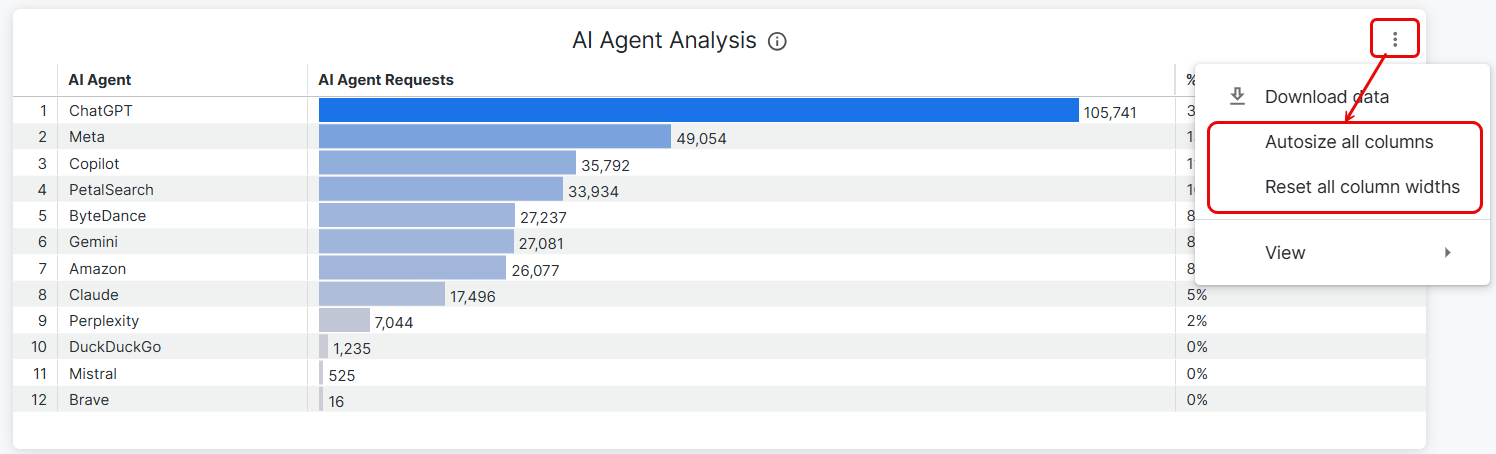 Hover your cursor over the card (for Crawl-to-Refer Ratio) or table title row (for AI Agent Analysis, Top 5 Request Volume Pages, and AI Request Volume Pages) and click Tile actions Download data to perform the following actions: