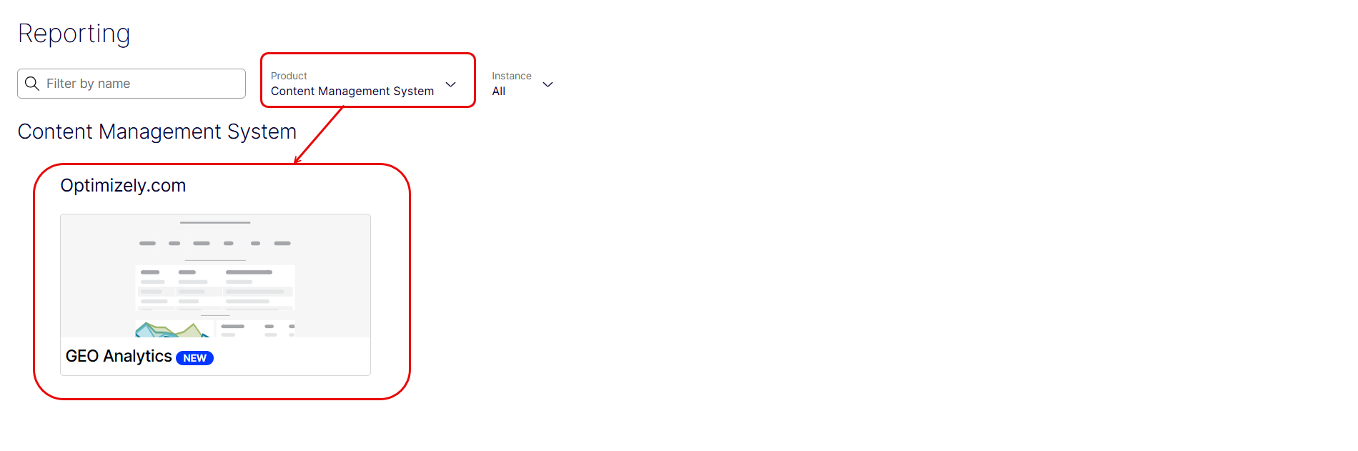 After you log in, scroll down and click the GEO Analytics dashboard, or select Content Management System from the Product drop-down list.