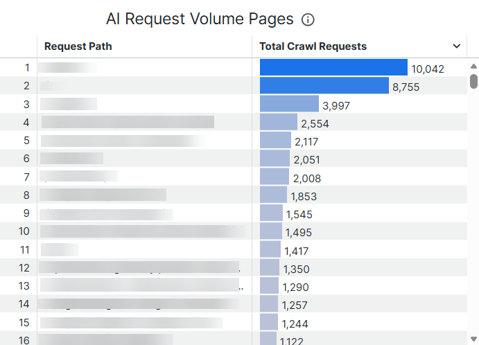 AI Request Volume Pages – Displays the number of total AI crawler requests for each page within your selected time period.