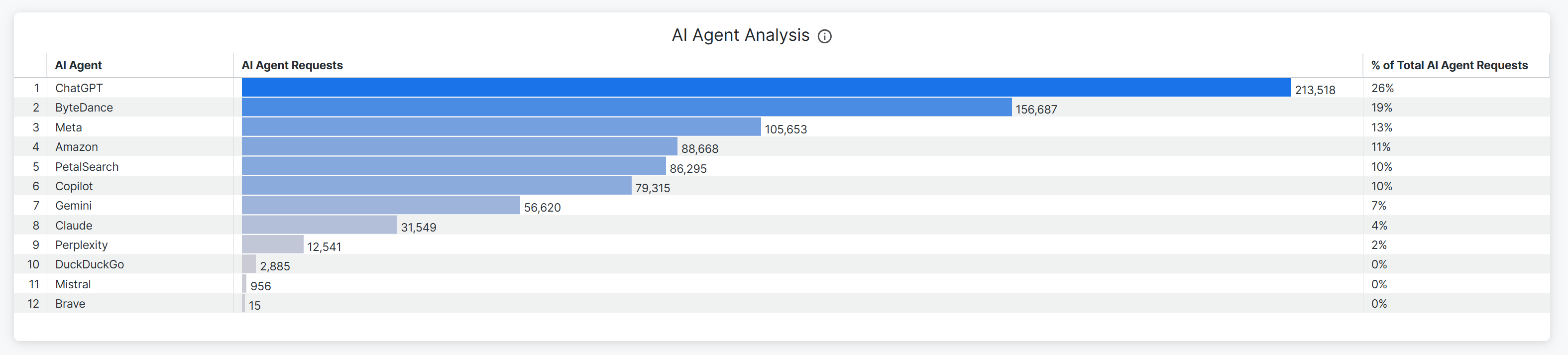 AI-Agent Analysis – Displays the summary of AI agent activity, categorized by request volume. The data table displays the top 12 AI agents that are static (including the top six displayed in the Crawl-to-Refer Ratio section), their corresponding request counts, and their percentage of total AI agent requests.