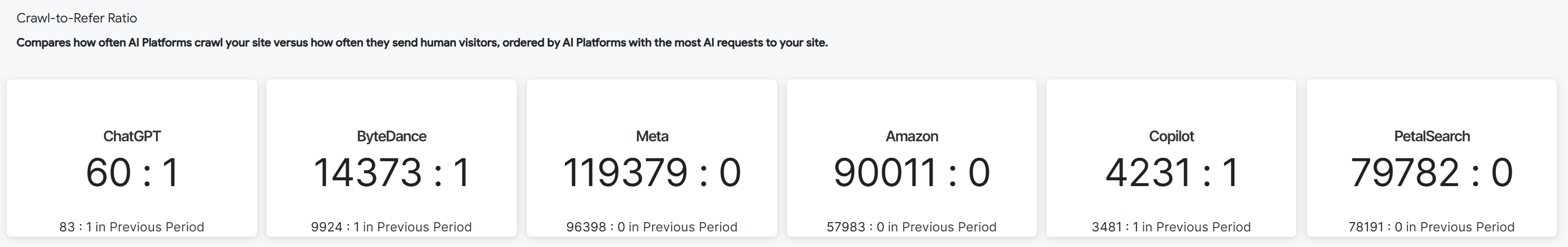 Crawl-to-Refer Ratio – Displays the crawl-to-refer ratio for the top six AI crawlers, ordered by AI platforms with the most AI requests to your site. The ratio compares how often AI crawlers visit your site to how often the crawls lead to referrals. A high ratio means crawlers are visiting your site frequently, but not using your content extensively. While a low ratio indicates that your pages are being referenced more proportionally. This metric helps you understand whether crawler activity is translating into real visibility within AI platforms. You should keep the ratio as low as possible.