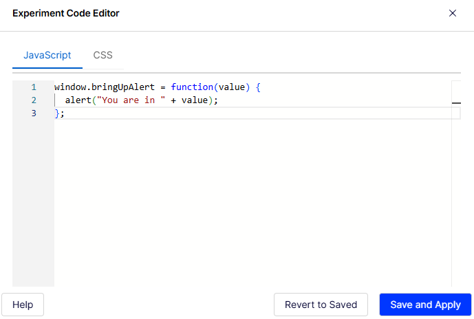 Experiment code within the Visual Editor is the same as the Shared Code page within the experiment. Any code you save and apply in one location, such as Experiment code within the Visual Editor, is automatically added to the other location, such as Shared Code within the experiment.